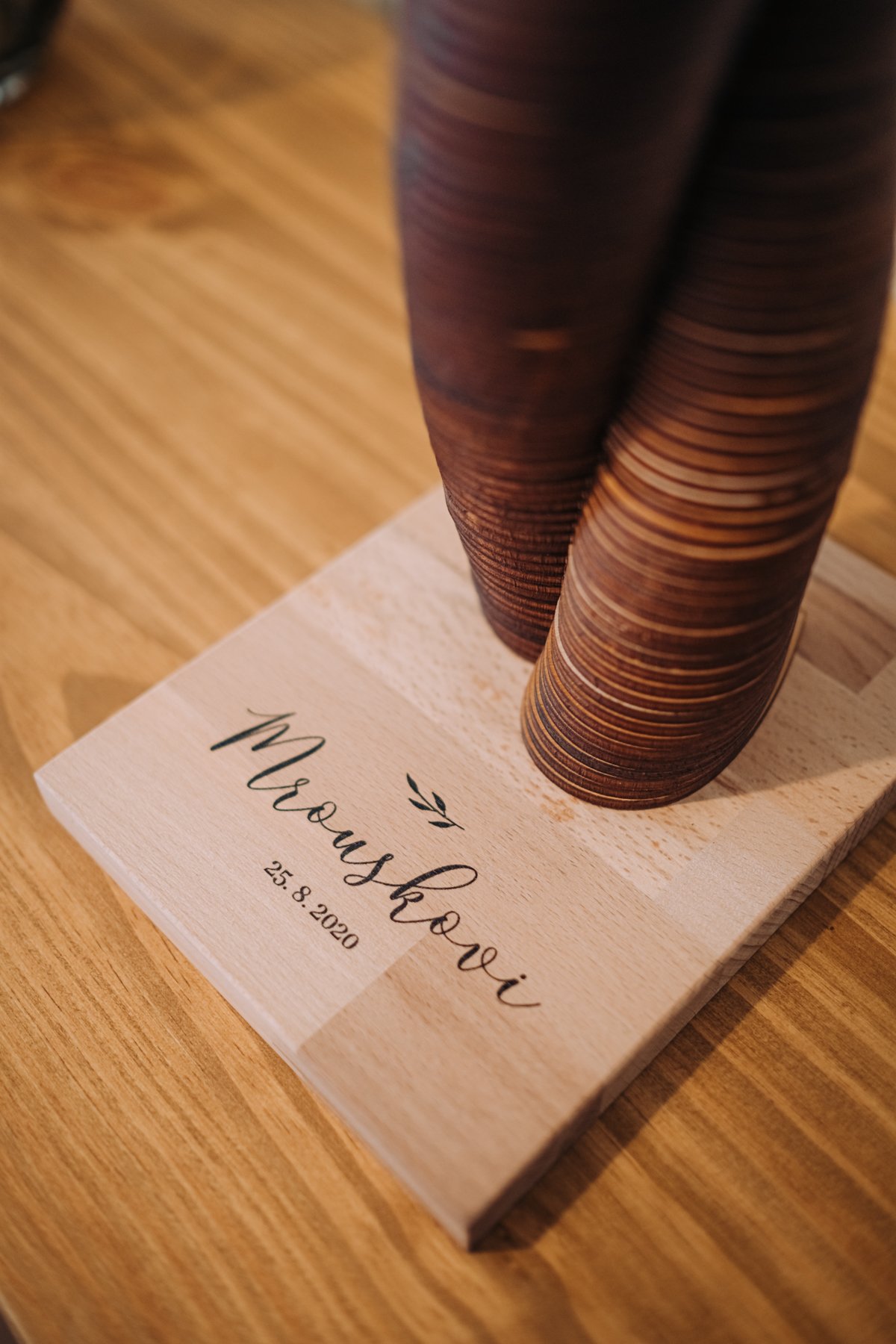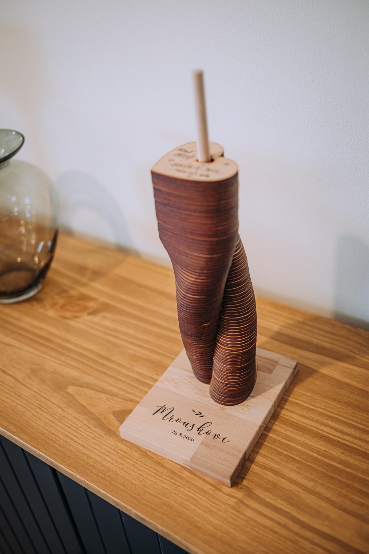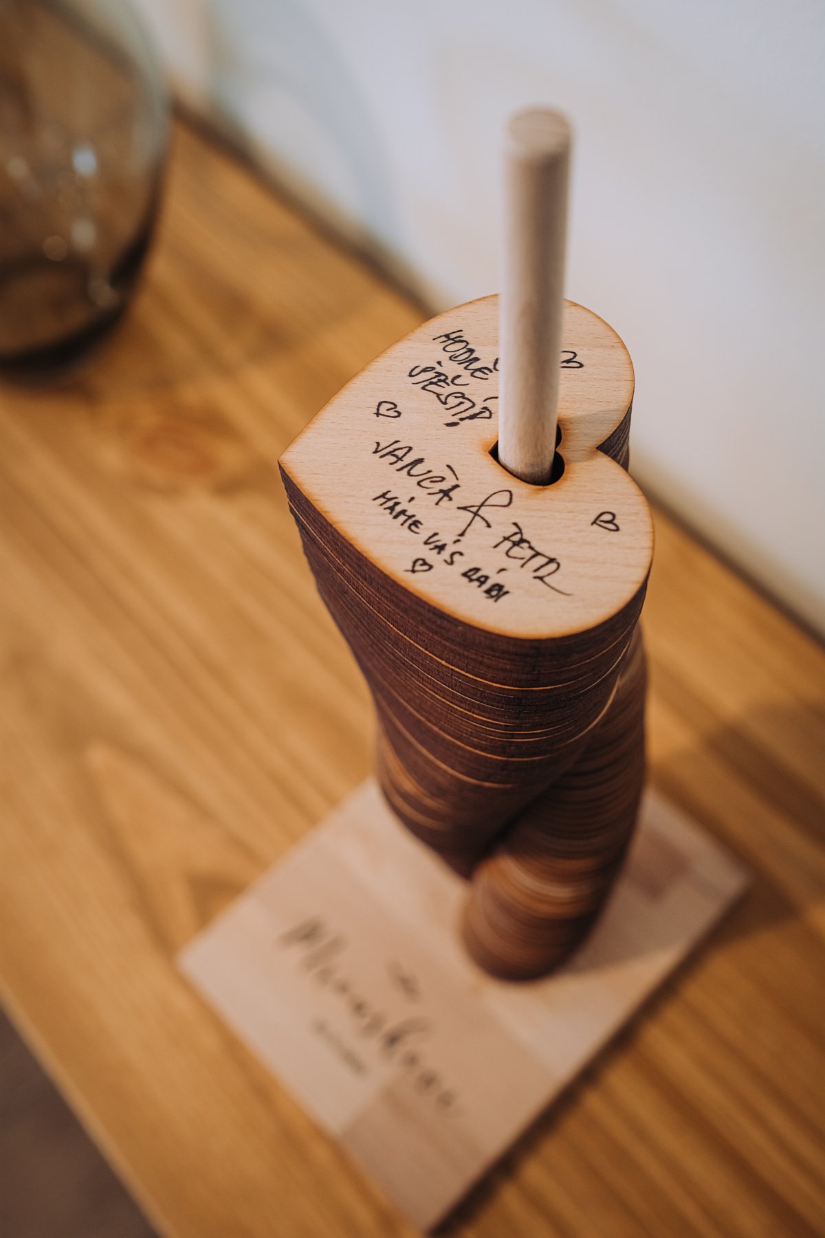 Originální svatební kniha hostů. Na masivní bukové podložce o rozměru 15 x 20 cm je připevněna kulatina, na kterou mohou hosté navlékat až 70 srdíček s jejich přáním nebo vzkazem. Srdíčka jsou součásí balení.