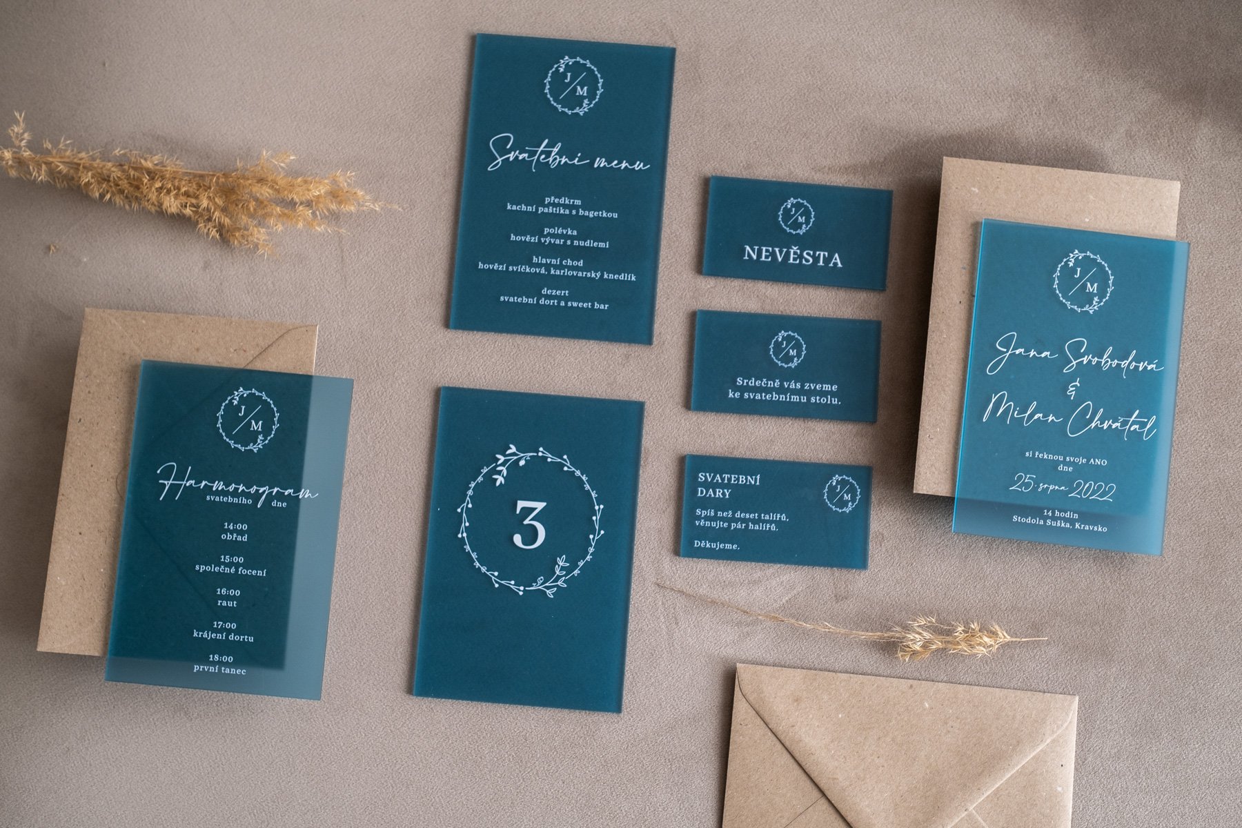 Ke všem plexi oznámením nabízíme další svatební tiskoviny ve stejném designu. Svatbu tak můžete mít od začátku až do konce perfektně sladěnou.